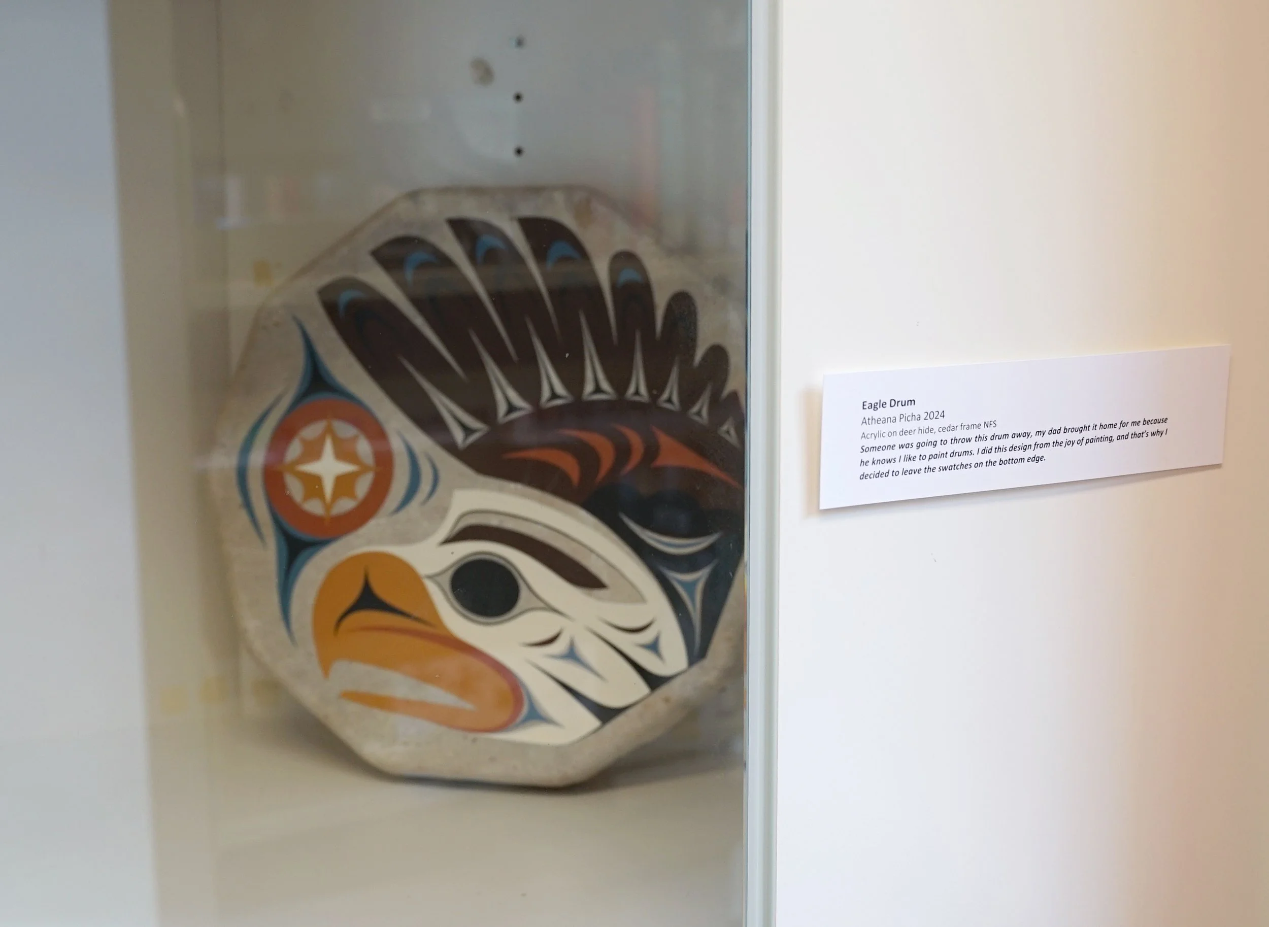 The 3rd annual Salish Art Exhibit on SḴŦAḴ / Mayne, this show highlighted Atheana Picha's work in serigraph, intaglio print, digital drawing, weaving, and painting on hide and on wood.